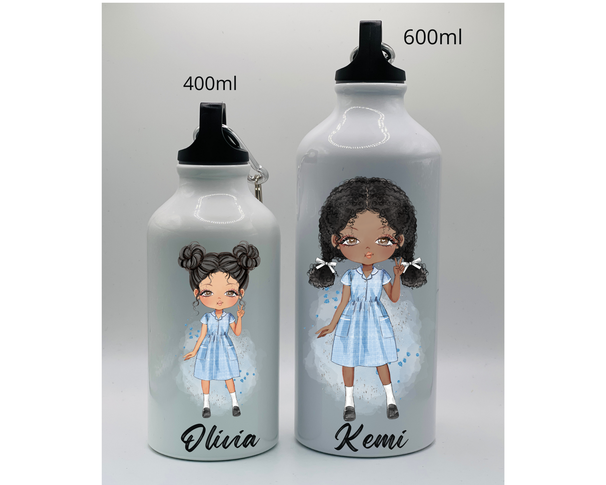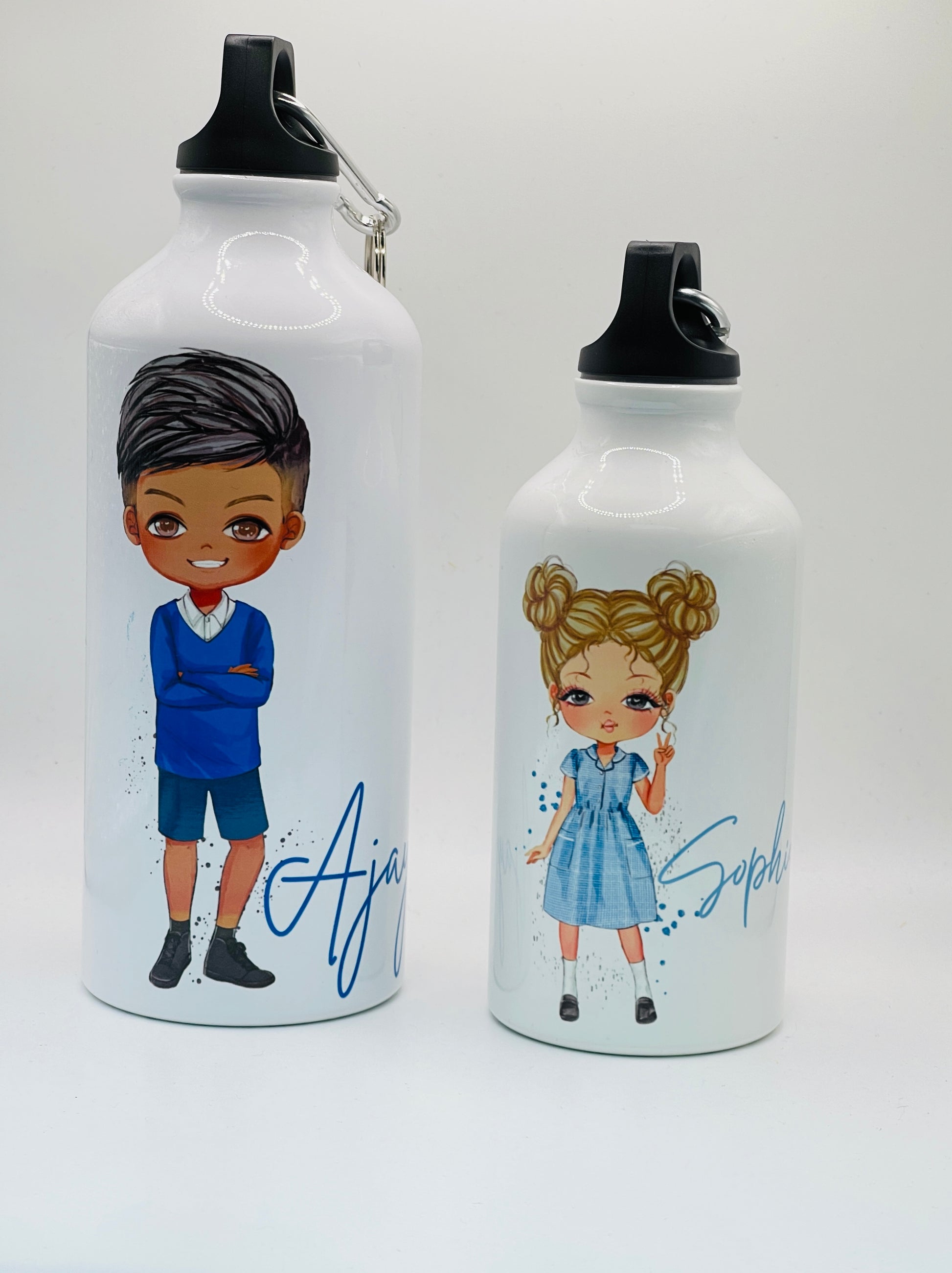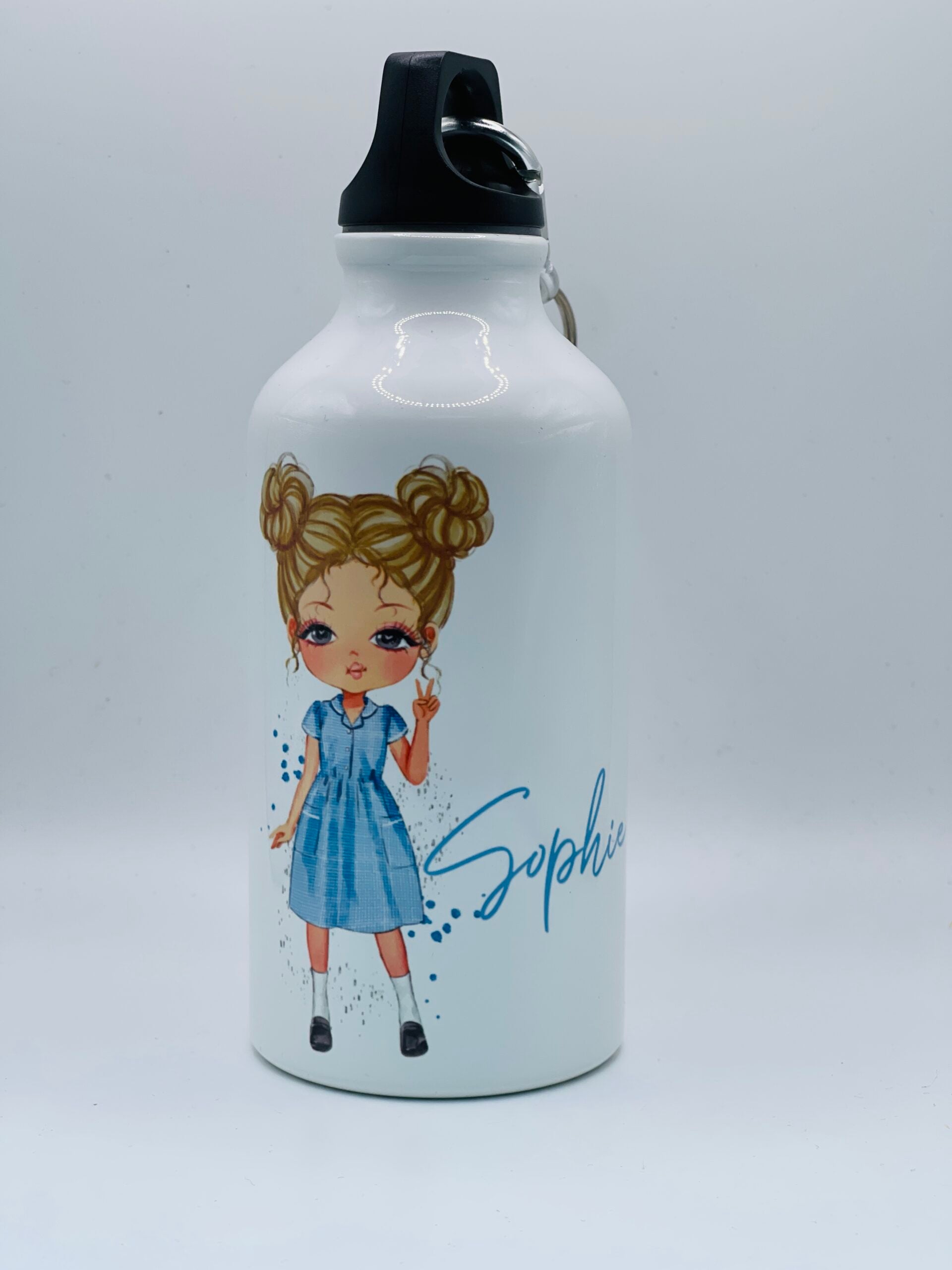 A gorgeous personalised Back to School blue uniform water bottle. This premium aluminium water bottles comes with both sports cap and loop carabiner clip. It is light and durable and perfect for keeping your little one hydrated at school or when you are on the go.